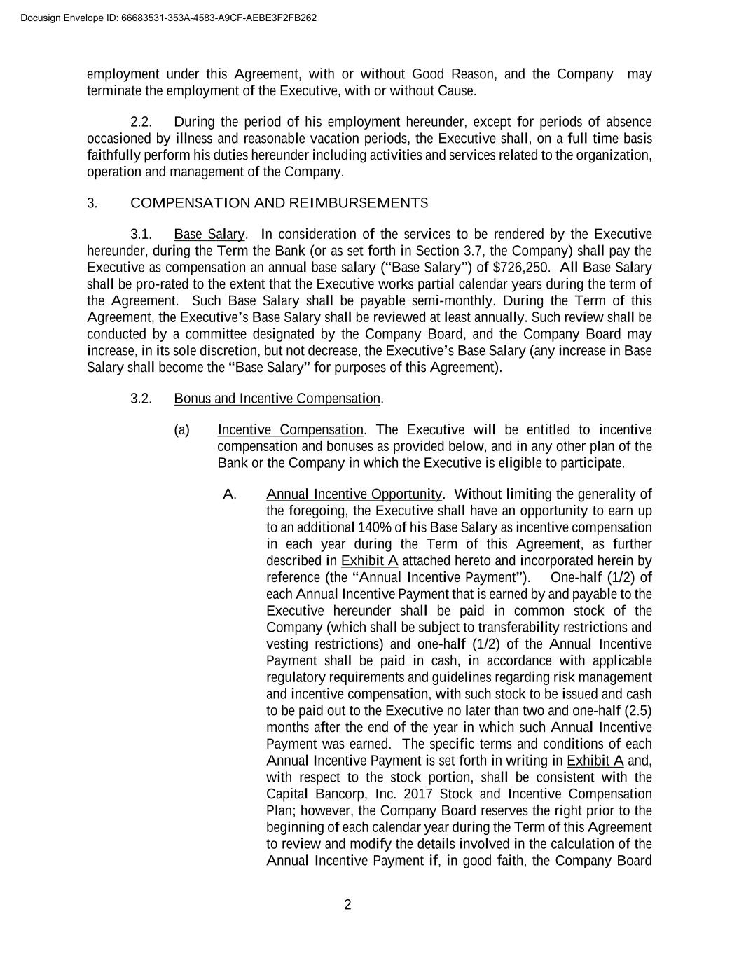 2 employment under this Agreement, with or without Good Reason, and the Company may terminate the employment of the Executive, with or without Cause. 2.2. During the period of his employment hereunder, except for periods of absence occasioned by illness and reasonable vacation periods, the Executive shall, on a full time basis faithfully perform his duties hereunder including activities and services related to the organization, operation and management of the Company. 3. COMPENSATION AND REIMBURSEMENTS 3.1. Base Salary. In consideration of the services to be rendered by the Executive hereunder, during the Term the Bank (or as set forth in Section 3.7, the Company) shall pay the Executive as compensation an annual base salary (“Base Salary”) of $726,250. All Base Salary shall be pro-rated to the extent that the Executive works partial calendar years during the term of the Agreement. Such Base Salary shall be payable semi-monthly. During the Term of this Agreement, the Executive’s Base Salary shall be reviewed at least annually. Such review shall be conducted by a committee designated by the Company Board, and the Company Board may increase, in its sole discretion, but not decrease, the Executive’s Base Salary (any increase in Base Salary shall become the “Base Salary” for purposes of this Agreement). 3.2. Bonus and Incentive Compensation. (a) Incentive Compensation. The Executive will be entitled to incentive compensation and bonuses as provided below, and in any other plan of the Bank or the Company in which the Executive is eligible to participate. A. Annual Incentive Opportunity. Without limiting the generality of the foregoing, the Executive shall have an opportunity to earn up to an additional 140% of his Base Salary as incentive compensation in each year during the Term of this Agreement, as further described in Exhibit A attached hereto and incorporated herein by reference (the “Annual Incentive Payment”). One-half (1/2) of each Annual Incentive Payment that is earned by and payable to the Executive hereunder shall be paid in common stock of the Company (which shall be subject to transferability restrictions and vesting restrictions) and one-half (1/2) of the Annual Incentive Payment shall be paid in cash, in accordance with applicable regulatory requirements and guidelines regarding risk management and incentive compensation, with such stock to be issued and cash to be paid out to the Executive no later than two and one-half (2.5) months after the end of the year in which such Annual Incentive Payment was earned. The specific terms and conditions of each Annual Incentive Payment is set forth in writing in Exhibit A and, with respect to the stock portion, shall be consistent with the Capital Bancorp, Inc. 2017 Stock and Incentive Compensation Plan; however, the Company Board reserves the right prior to the beginning of each calendar year during the Term of this Agreement to review and modify the details involved in the calculation of the Annual Incentive Payment if, in good faith, the Company Board Docusign Envelope ID: 66683531-353A-4583-A9CF-AEBE3F2FB262