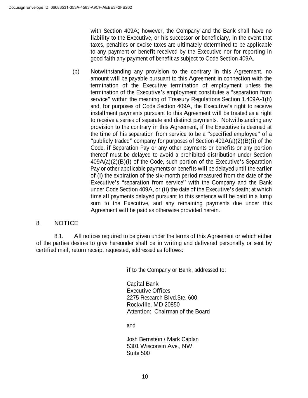 10 with Section 409A; however, the Company and the Bank shall have no liability to the Executive, or his successor or beneficiary, in the event that taxes, penalties or excise taxes are ultimately determined to be applicable to any payment or benefit received by the Executive nor for reporting in good faith any payment of benefit as subject to Code Section 409A. (b) Notwithstanding any provision to the contrary in this Agreement, no amount will be payable pursuant to this Agreement in connection with the termination of the Executive termination of employment unless the termination of the Executive’s employment constitutes a “separation from service” within the meaning of Treasury Regulations Section 1.409A-1(h) and, for purposes of Code Section 409A, the Executive’s right to receive installment payments pursuant to this Agreement will be treated as a right to receive a series of separate and distinct payments. Notwithstanding any provision to the contrary in this Agreement, if the Executive is deemed at the time of his separation from service to be a “specified employee” of a “publicly traded” company for purposes of Section 409A(a)(2)(B)(i) of the Code, if Separation Pay or any other payments or benefits or any portion thereof must be delayed to avoid a prohibited distribution under Section 409A(a)(2)(B)(i) of the Code, such portion of the Executive’s Separation Pay or other applicable payments or benefits will be delayed until the earlier of (i) the expiration of the six-month period measured from the date of the Executive’s “separation from service” with the Company and the Bank under Code Section 409A, or (ii) the date of the Executive’s death; at which time all payments delayed pursuant to this sentence will be paid in a lump sum to the Executive, and any remaining payments due under this Agreement will be paid as otherwise provided herein. 8. NOTICE 8.1. All notices required to be given under the terms of this Agreement or which either of the parties desires to give hereunder shall be in writing and delivered personally or sent by certified mail, return receipt requested, addressed as follows: if to the Company or Bank, addressed to: Capital Bank Executive Offices 2275 Research Blvd.Ste. 600 Rockville, MD 20850 Attention: Chairman of the Board and Josh Bernstein / Mark Caplan 5301 Wisconsin Ave., NW Suite 500 Docusign Envelope ID: 66683531-353A-4583-A9CF-AEBE3F2FB262