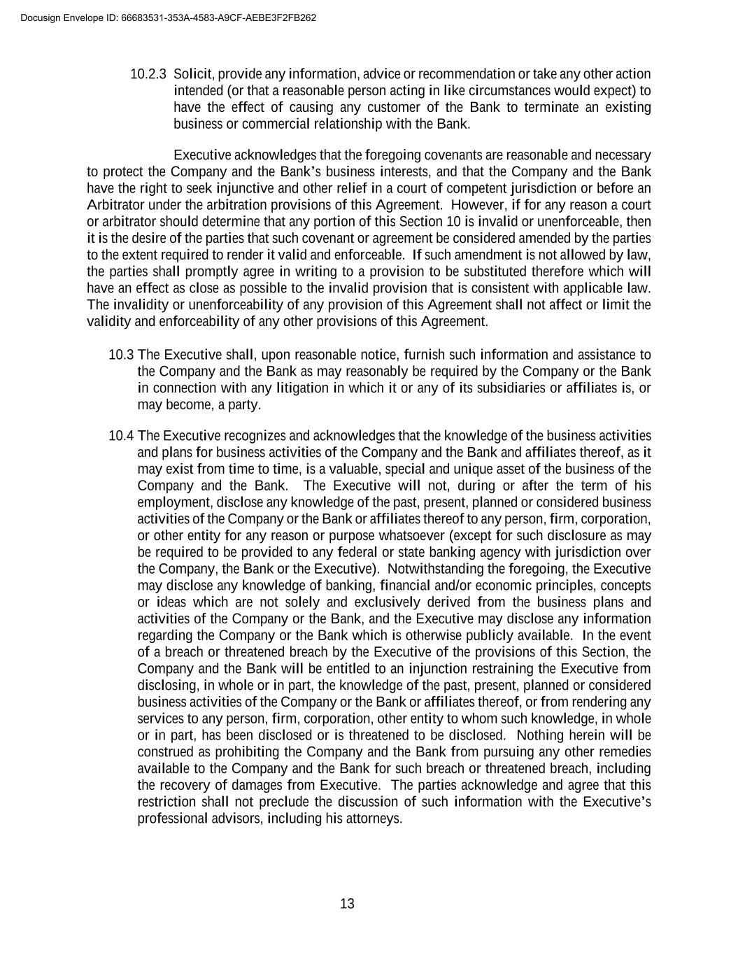 13 10.2.3 Solicit, provide any information, advice or recommendation or take any other action intended (or that a reasonable person acting in like circumstances would expect) to have the effect of causing any customer of the Bank to terminate an existing business or commercial relationship with the Bank. Executive acknowledges that the foregoing covenants are reasonable and necessary to protect the Company and the Bank’s business interests, and that the Company and the Bank have the right to seek injunctive and other relief in a court of competent jurisdiction or before an Arbitrator under the arbitration provisions of this Agreement. However, if for any reason a court or arbitrator should determine that any portion of this Section 10 is invalid or unenforceable, then it is the desire of the parties that such covenant or agreement be considered amended by the parties to the extent required to render it valid and enforceable. If such amendment is not allowed by law, the parties shall promptly agree in writing to a provision to be substituted therefore which will have an effect as close as possible to the invalid provision that is consistent with applicable law. The invalidity or unenforceability of any provision of this Agreement shall not affect or limit the validity and enforceability of any other provisions of this Agreement. 10.3 The Executive shall, upon reasonable notice, furnish such information and assistance to the Company and the Bank as may reasonably be required by the Company or the Bank in connection with any litigation in which it or any of its subsidiaries or affiliates is, or may become, a party. 10.4 The Executive recognizes and acknowledges that the knowledge of the business activities and plans for business activities of the Company and the Bank and affiliates thereof, as it may exist from time to time, is a valuable, special and unique asset of the business of the Company and the Bank. The Executive will not, during or after the term of his employment, disclose any knowledge of the past, present, planned or considered business activities of the Company or the Bank or affiliates thereof to any person, firm, corporation, or other entity for any reason or purpose whatsoever (except for such disclosure as may be required to be provided to any federal or state banking agency with jurisdiction over the Company, the Bank or the Executive). Notwithstanding the foregoing, the Executive may disclose any knowledge of banking, financial and/or economic principles, concepts or ideas which are not solely and exclusively derived from the business plans and activities of the Company or the Bank, and the Executive may disclose any information regarding the Company or the Bank which is otherwise publicly available. In the event of a breach or threatened breach by the Executive of the provisions of this Section, the Company and the Bank will be entitled to an injunction restraining the Executive from disclosing, in whole or in part, the knowledge of the past, present, planned or considered business activities of the Company or the Bank or affiliates thereof, or from rendering any services to any person, firm, corporation, other entity to whom such knowledge, in whole or in part, has been disclosed or is threatened to be disclosed. Nothing herein will be construed as prohibiting the Company and the Bank from pursuing any other remedies available to the Company and the Bank for such breach or threatened breach, including the recovery of damages from Executive. The parties acknowledge and agree that this restriction shall not preclude the discussion of such information with the Executive’s professional advisors, including his attorneys. Docusign Envelope ID: 66683531-353A-4583-A9CF-AEBE3F2FB262