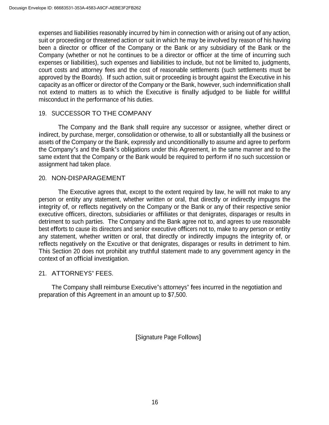 16 expenses and liabilities reasonably incurred by him in connection with or arising out of any action, suit or proceeding or threatened action or suit in which he may be involved by reason of his having been a director or officer of the Company or the Bank or any subsidiary of the Bank or the Company (whether or not he continues to be a director or officer at the time of incurring such expenses or liabilities), such expenses and liabilities to include, but not be limited to, judgments, court costs and attorney fees and the cost of reasonable settlements (such settlements must be approved by the Boards). If such action, suit or proceeding is brought against the Executive in his capacity as an officer or director of the Company or the Bank, however, such indemnification shall not extend to matters as to which the Executive is finally adjudged to be liable for willful misconduct in the performance of his duties. 19. SUCCESSOR TO THE COMPANY The Company and the Bank shall require any successor or assignee, whether direct or indirect, by purchase, merger, consolidation or otherwise, to all or substantially all the business or assets of the Company or the Bank, expressly and unconditionally to assume and agree to perform the Company’s and the Bank’s obligations under this Agreement, in the same manner and to the same extent that the Company or the Bank would be required to perform if no such succession or assignment had taken place. 20. NON-DISPARAGEMENT The Executive agrees that, except to the extent required by law, he will not make to any person or entity any statement, whether written or oral, that directly or indirectly impugns the integrity of, or reflects negatively on the Company or the Bank or any of their respective senior executive officers, directors, subsidiaries or affiliates or that denigrates, disparages or results in detriment to such parties. The Company and the Bank agree not to, and agrees to use reasonable best efforts to cause its directors and senior executive officers not to, make to any person or entity any statement, whether written or oral, that directly or indirectly impugns the integrity of, or reflects negatively on the Excutive or that denigrates, disparages or results in detriment to him. This Section 20 does not prohibit any truthful statement made to any government agency in the context of an official investigation. 21. ATTORNEYS’ FEES. The Company shall reimburse Executive’s attorneys’ fees incurred in the negotiation and preparation of this Agreement in an amount up to $7,500. [Signature Page Follows] Docusign Envelope ID: 66683531-353A-4583-A9CF-AEBE3F2FB262