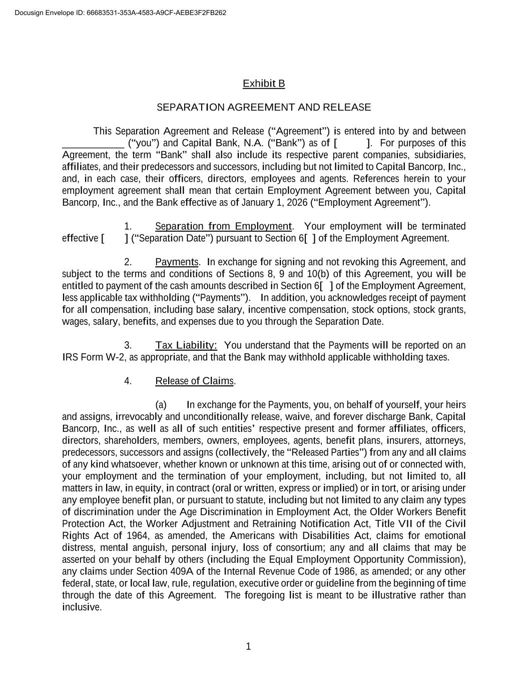 1 Exhibit B SEPARATION AGREEMENT AND RELEASE This Separation Agreement and Release (“Agreement”) is entered into by and between ____________ (“you”) and Capital Bank, N.A. (“Bank”) as of [ ]. For purposes of this Agreement, the term “Bank” shall also include its respective parent companies, subsidiaries, affiliates, and their predecessors and successors, including but not limited to Capital Bancorp, Inc., and, in each case, their officers, directors, employees and agents. References herein to your employment agreement shall mean that certain Employment Agreement between you, Capital Bancorp, Inc., and the Bank effective as of January 1, 2026 (“Employment Agreement”). 1. Separation from Employment. Your employment will be terminated effective [ ] (“Separation Date”) pursuant to Section 6[ ] of the Employment Agreement. 2. Payments. In exchange for signing and not revoking this Agreement, and subject to the terms and conditions of Sections 8, 9 and 10(b) of this Agreement, you will be entitled to payment of the cash amounts described in Section 6[ ] of the Employment Agreement, less applicable tax withholding (“Payments”). In addition, you acknowledges receipt of payment for all compensation, including base salary, incentive compensation, stock options, stock grants, wages, salary, benefits, and expenses due to you through the Separation Date. 3. Tax Liability: You understand that the Payments will be reported on an IRS Form W-2, as appropriate, and that the Bank may withhold applicable withholding taxes. 4. Release of Claims. (a) In exchange for the Payments, you, on behalf of yourself, your heirs and assigns, irrevocably and unconditionally release, waive, and forever discharge Bank, Capital Bancorp, Inc., as well as all of such entities’ respective present and former affiliates, officers, directors, shareholders, members, owners, employees, agents, benefit plans, insurers, attorneys, predecessors, successors and assigns (collectively, the “Released Parties”) from any and all claims of any kind whatsoever, whether known or unknown at this time, arising out of or connected with, your employment and the termination of your employment, including, but not limited to, all matters in law, in equity, in contract (oral or written, express or implied) or in tort, or arising under any employee benefit plan, or pursuant to statute, including but not limited to any claim any types of discrimination under the Age Discrimination in Employment Act, the Older Workers Benefit Protection Act, the Worker Adjustment and Retraining Notification Act, Title VII of the Civil Rights Act of 1964, as amended, the Americans with Disabilities Act, claims for emotional distress, mental anguish, personal injury, loss of consortium; any and all claims that may be asserted on your behalf by others (including the Equal Employment Opportunity Commission), any claims under Section 409A of the Internal Revenue Code of 1986, as amended; or any other federal, state, or local law, rule, regulation, executive order or guideline from the beginning of time through the date of this Agreement. The foregoing list is meant to be illustrative rather than inclusive. Docusign Envelope ID: 66683531-353A-4583-A9CF-AEBE3F2FB262
