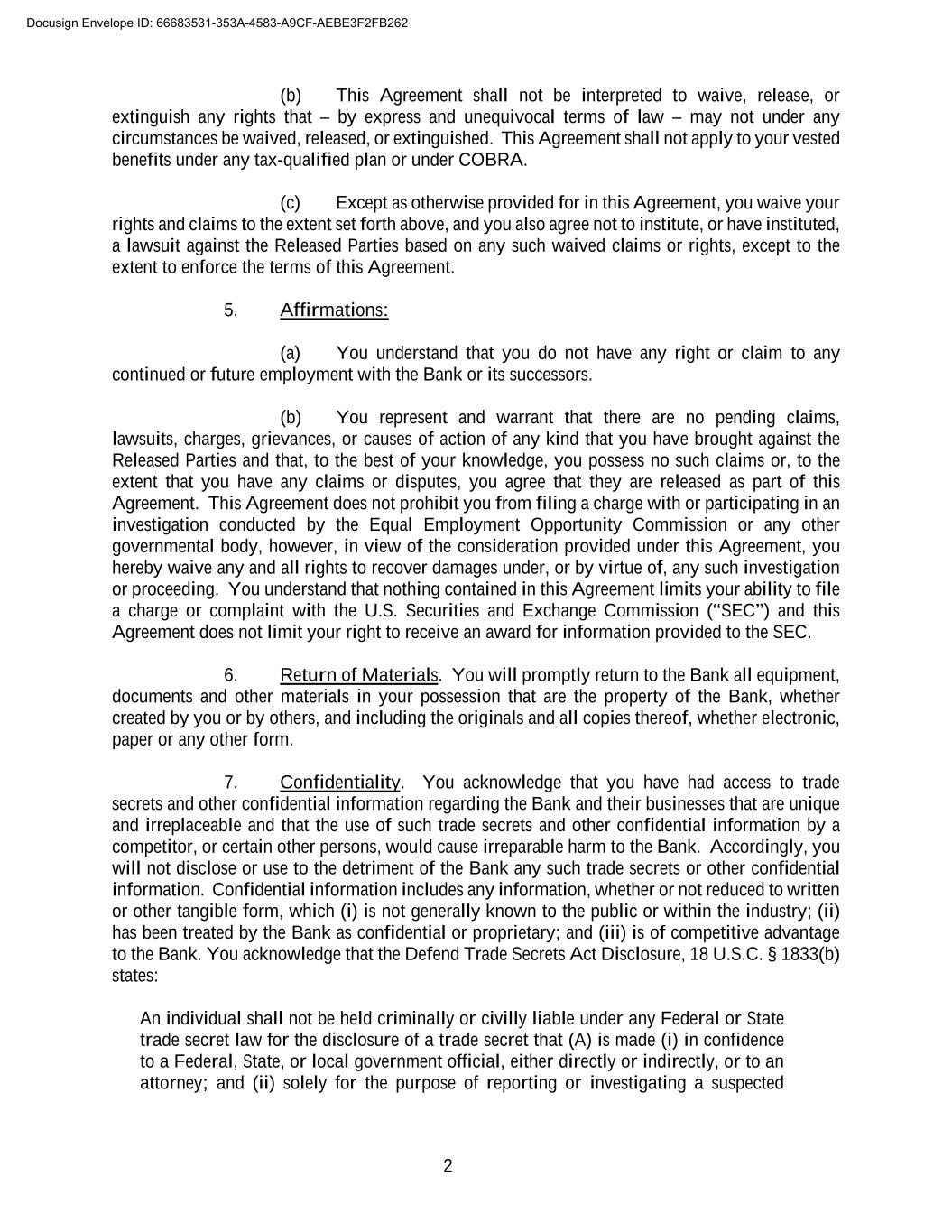 2 (b) This Agreement shall not be interpreted to waive, release, or extinguish any rights that – by express and unequivocal terms of law – may not under any circumstances be waived, released, or extinguished. This Agreement shall not apply to your vested benefits under any tax-qualified plan or under COBRA. (c) Except as otherwise provided for in this Agreement, you waive your rights and claims to the extent set forth above, and you also agree not to institute, or have instituted, a lawsuit against the Released Parties based on any such waived claims or rights, except to the extent to enforce the terms of this Agreement. 5. Affirmations: (a) You understand that you do not have any right or claim to any continued or future employment with the Bank or its successors. (b) You represent and warrant that there are no pending claims, lawsuits, charges, grievances, or causes of action of any kind that you have brought against the Released Parties and that, to the best of your knowledge, you possess no such claims or, to the extent that you have any claims or disputes, you agree that they are released as part of this Agreement. This Agreement does not prohibit you from filing a charge with or participating in an investigation conducted by the Equal Employment Opportunity Commission or any other governmental body, however, in view of the consideration provided under this Agreement, you hereby waive any and all rights to recover damages under, or by virtue of, any such investigation or proceeding. You understand that nothing contained in this Agreement limits your ability to file a charge or complaint with the U.S. Securities and Exchange Commission (“SEC”) and this Agreement does not limit your right to receive an award for information provided to the SEC. 6. Return of Materials. You will promptly return to the Bank all equipment, documents and other materials in your possession that are the property of the Bank, whether created by you or by others, and including the originals and all copies thereof, whether electronic, paper or any other form. 7. Confidentiality. You acknowledge that you have had access to trade secrets and other confidential information regarding the Bank and their businesses that are unique and irreplaceable and that the use of such trade secrets and other confidential information by a competitor, or certain other persons, would cause irreparable harm to the Bank. Accordingly, you will not disclose or use to the detriment of the Bank any such trade secrets or other confidential information. Confidential information includes any information, whether or not reduced to written or other tangible form, which (i) is not generally known to the public or within the industry; (ii) has been treated by the Bank as confidential or proprietary; and (iii) is of competitive advantage to the Bank. You acknowledge that the Defend Trade Secrets Act Disclosure, 18 U.S.C. § 1833(b) states: An individual shall not be held criminally or civilly liable under any Federal or State trade secret law for the disclosure of a trade secret that (A) is made (i) in confidence to a Federal, State, or local government official, either directly or indirectly, or to an attorney; and (ii) solely for the purpose of reporting or investigating a suspected Docusign Envelope ID: 66683531-353A-4583-A9CF-AEBE3F2FB262